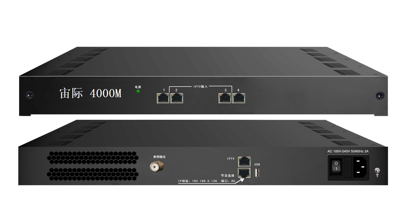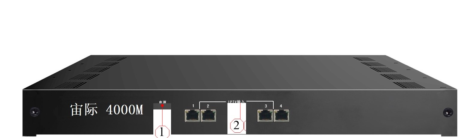 该设备前面板有4个百兆网口,4个网口均为IPTV信号输入;后面板有1个射频输出口、2个IP口和一个USB接口,射频口支持3个或4个DTMB单载波输出,2个网口分别为1路百兆/千兆自适应IPTV输出和网管口(主要作用选择节目)。